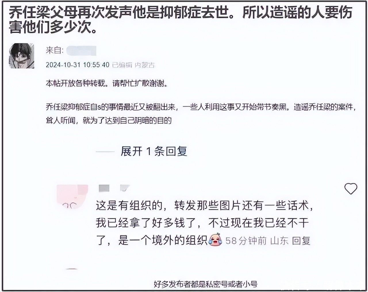 此前就有人怀疑乔任梁的事情是有人恶意炒作,还有做过水军的人分析某些图片和话术一看就是有组织的,甚至有人出面承认拿钱干过这事。